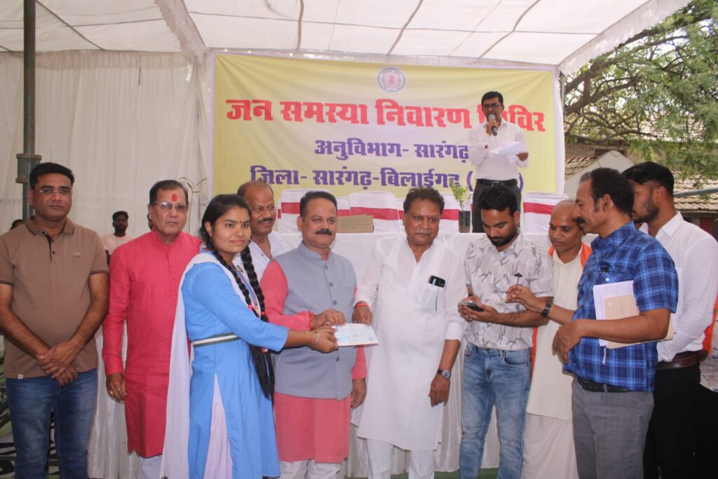 सारंगढ़। कलेक्टर डॉ. संजय कन्नौजे के निर्देशानुसार सारंगढ़ एसडीएम कार्यालय परिसर में अनुविभाग स्तरीय जनसमस्या निवारण शिविर का आयोजन किया गया। शिविर में विभिन्न विभागों द्वारा आम नागरिकों की समस्याएं सुनी गईं और त्वरित निराकरण के प्रयास किए गए। शिविर के दौरान महिला एवं बाल विकास विभाग द्वारा अन्नप्राशन, गोदभराई एवं बालिका जन्मोत्सव कार्यक्रम आयोजित किए गए। साथ ही रेडी-टू-ईट व्यंजनों की प्रदर्शनी तथा महतारी वंदन योजना से संबंधित जानकारी भी प्रदर्शनी के माध्यम से दी गई। इस शिविर में कलेक्टर डॉ संजय कन्नौजे, एसडी एम वर्षा बंसल, जिला पंचायत अध्यक्ष संजय भूषण पाण्डेय, जिला अध्यक्ष ज्योति पटेल सहित अन्य जनप्रतिनिधि एवं अधिकारी- कर्मचारी उपस्थित रहे। कार्यक्रम में विभिन्न विभागों से कुल 97 से अधिक आवेदन प्राप्त हुए, जिनके निराकरण हेतु संबंधित अधिकारियों को निर्देशित किया गया। कृषि विभाग द्वारा 10 किसानों को कीटनाशक दवाओं का वितरण किया गया। वहीं शिक्षा विभाग द्वारा कक्षा 10वीं में 90 प्रतिशत से अधिक अंक प्राप्त करने वाली बालिकाओं को प्रोत्साहन स्वरूप चेक प्रदान किए गए। उद्यानिकी विभाग द्वारा किसानों को फलदार पौधों का वितरण कर उन्हें बागवानी के प्रति प्रोत्साहित किया गया।