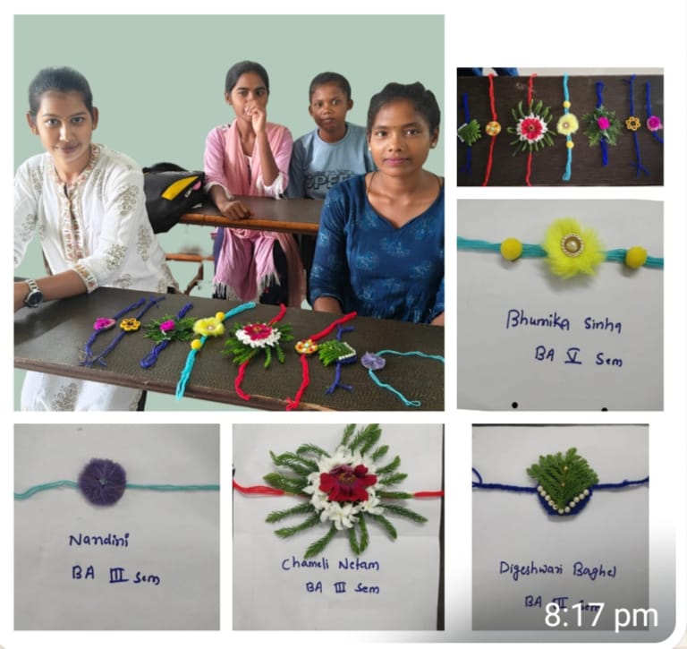 भूमिका, चमेली, नंदनी एवं डिगेश्वरी बघेल ने उत्कृष्ट राखियाँ बनाई। प्रतियोगिता के अंत में उत्कृष्ट राखियों को पुरस्कृत कर विश्वविद्यालय के मुख्य कार्यक्रम में सभी प्रतिभागियों को प्रशस्ति पत्र प्रदान किया जाएगा।