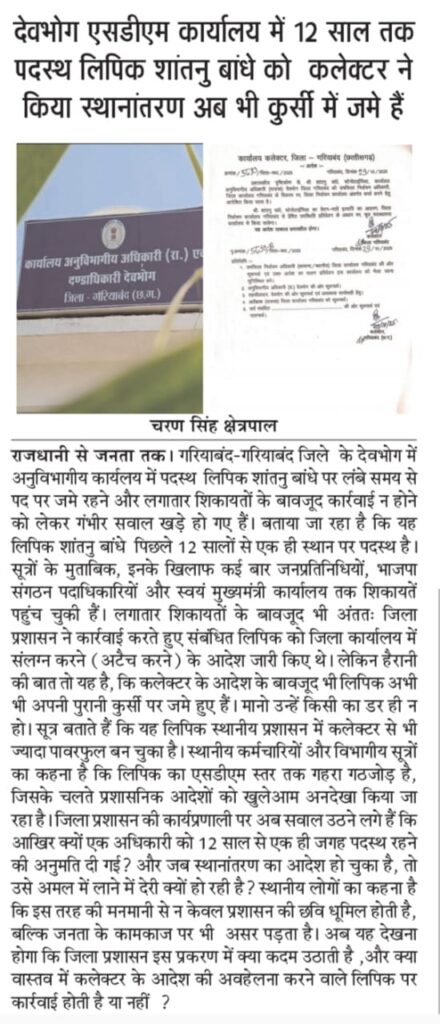 गरियाबंद/देवभोग -देवभोग ब्लॉक में राजस्व विभाग की मनमानी आखिरकार उजागर हो ही गई। दैनिक अखबार “राजधानी से जनता तक” में प्रकाशित खबर — “देवभोग में राजस्व विभाग का खुला खेल! शासन आदेश ताक पर, एसडीएम स्टेनो टाइपिस्ट बना हटा देवभोग एसडीएम कार्यालय से” — का ज़बरदस्त असर हुआ है। शासन-प्रशासन हरकत में आया और कलेक्टर ने एसडीएम कार्यालय में पदस्थ स्टेनो टाइपिस्ट बांधे को पद से हटा दिया।