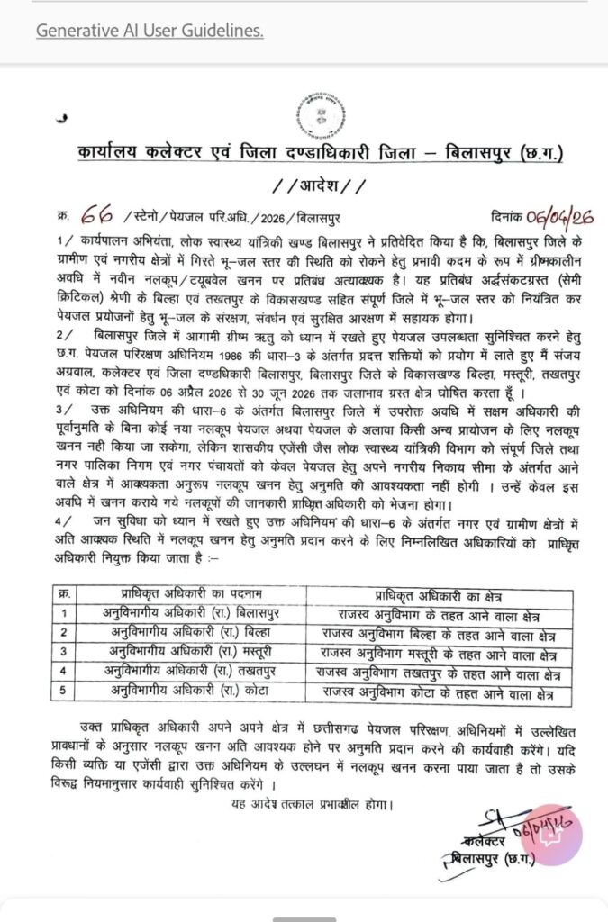 आदेश के तहत बिलासपुर जिले के विकासखंड बिल्हा, मस्तूरी, तखतपुर एवं कोटा को 6 अप्रैल 2026 से 30 जून 2026 तक जलाभावग्रस्त क्षेत्र घोषित किया गया है। इस अवधि में सक्षम अधिकारी की पूर्व अनुमति के बिना कोई भी व्यक्ति या संस्था नए नलकूप खनन नहीं कर सकेगी। हालांकि, लोक स्वास्थ्य यांत्रिकी विभाग, नगर निगम एवं नगर पंचायतों जैसी शासकीय एजेंसियों को केवल पेयजल आपूर्ति हेतु आवश्यकता अनुसार नलकूप खनन की अनुमति दी गई है। इसके लिए उन्हें पूर्व अनुमति की आवश्यकता नहीं होगी, लेकिन संबंधित कार्यों की जानकारी अधिकृत अधिकारियों को देना अनिवार्य होगा।