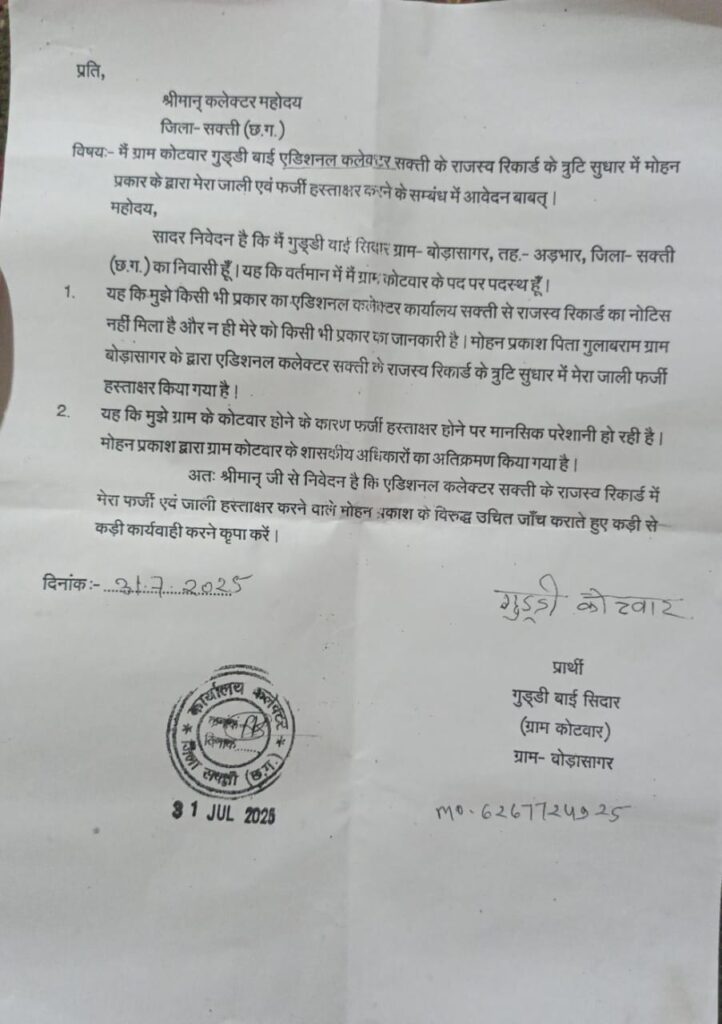 सक्ति। जिले में एक हैरान कर देने वाला मामला सामने आया है, जिसने पूरे गांव में हलचल मचा दी है ग्राम पंचायत बोड़ा सागर की कोटवार गुड्डी बाई सिदार ने अपने नाम से फर्जी हस्ताक्षर किए जाने का गंभीर आरोप लगाते हुए प्रशासन से न्याय की मांग की है गुड्डी बाई सिदार का आरोप है कि बिना किसी नोटिस, अनुमति और जानकारी के, ग्राम बोड़ा सागर निवासी मोहन प्रकाश ने राजस्व रिकॉर्ड के त्रुटि सुधार में उनके नाम का फर्जी हस्ताक्षर कर दिया। यह कार्यवाही एडिशनल कलेक्टर कार्यालय और राजस्व विभाग की प्रक्रिया को दरकिनार करते हुए की गई, जिससे उन्हें गहरा मानसिक आघात पहुंचा है, उन्होंने बताया कि इस फर्जीवाड़े के चलते वे लगातार मानसिक तनाव और सामाजिक दबाव झेल रही हैं। पीड़ित कोटवार ने इस पूरे प्रकरण में कलेक्टर को लिखित दरखास्त देकर दोषियों पर सख्त कार्रवाई की मांग की है, ताकि भविष्य में कोई भी इस तरह की गैरकानूनी हरकत करने का साहस न कर सके। गांव में यह मामला तेजी से चर्चा का विषय बन गया है ग्रामीणों का कहना है कि यदि सरकारी रिकॉर्ड में इस तरह की फर्जी हस्ताक्षर और दस्तावेज़ में हेराफेरी होने लगे तो ईमानदार कर्मचारियों का मनोबल टूट जाएगा और शासन की विश्वसनीयता पर भी सवाल खड़े होंगे। अब देखना यह होगा कि प्रशासन इस फर्जी हस्ताक्षर और राजस्व रिकॉर्ड में हेराफेरी के गंभीर आरोप को किस तरह लेता है और दोषियों पर क्या कार्यवाही करता है। फिलहाल ग्रामीणों की नजरें कलेक्टर के निर्णय पर टिकी हुई हैं।