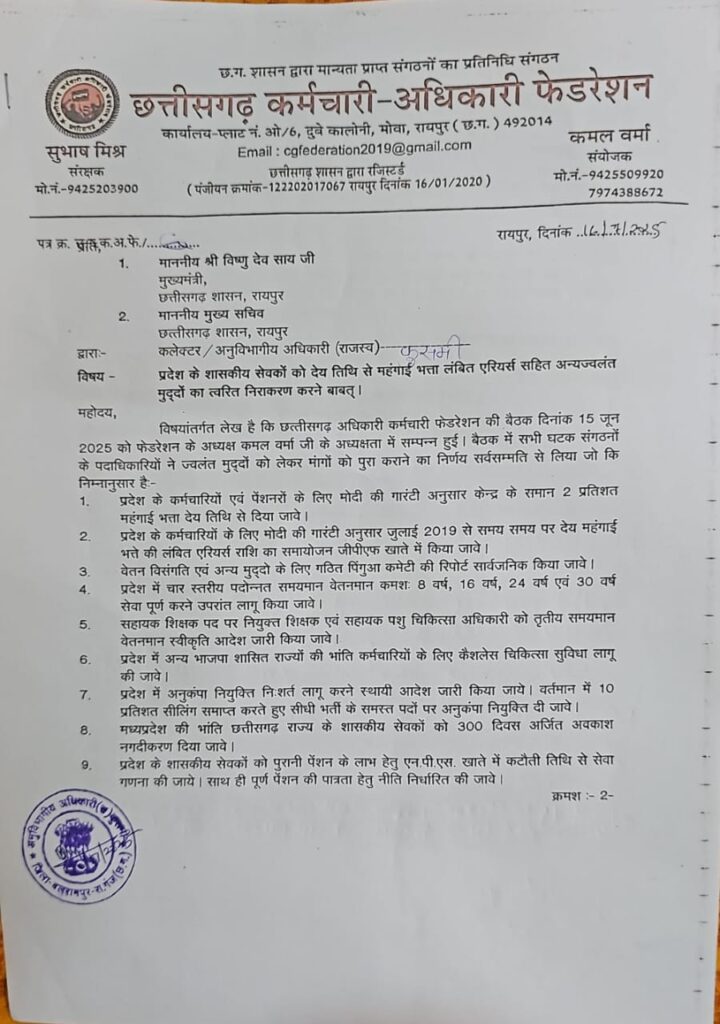 कुसमी।  छत्तीसगढ़ के कर्मचारी अधिकारियों की जायज मांगे शामिल हैं 1. प्रदेश के कर्मचारियों एवं पेंशनरों के लिए मोदी की गारंटी अनुसार केन्द्र के समान 2 प्रतिशत महंगाई भत्ता तिथि से दिया जाये।
