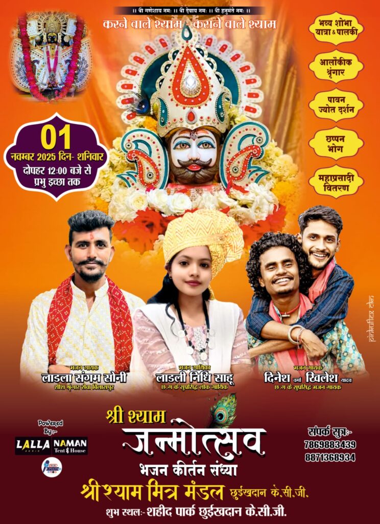 एवं शाम 4 बजे से महाप्रसादी भंडारे का भी आयोजन किया गया है । वहीं शाम 7 बजे से भव्य भजन संध्या का आयोजन किया जाएगा, जिसमें प्रसिद्ध भजन गायक लाडला संगम सोनी शीश श्रृंगार सेवा बिलासपुर से, छत्तीसगढ़ के सुप्रसिद्ध भजन गायिका लाडली निधि साहू, एवं छत्तीसगढ़ के सुप्रसिद्ध भजन गायक माटी पुत्र भईया खिलेश यादव और दिनेश वर्मा जैसे कलाकारों द्वारा भावपूर्ण भजनों की प्रस्तुति दी जाएगी। कार्यक्रम के समापन पर सामूहिक भंडारा रखा गया है। आयोजन समिति ने सभी श्रद्धालुओं से परिवार सहित कार्यक्रम में सम्मिलित होकर खाटू श्याम जी का आशीर्वाद प्राप्त करने की अपील की है।