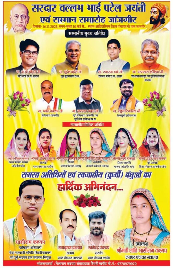 रिगनी / खरौद भारत के लौहपुरुष, एकता के प्रतीक और देश के प्रथम गृह मंत्री सरदार वल्लभभाई पटेल की जयंती के अवसर पर दिनांक 16 नवंबर 2025, दिन रविवार को सुबह 10 बजे से जांजगीर स्थित ऑडिटोरियम हॉल (जिला पंचायत के पास) में भव्य सम्मान समारोह आयोजित किया जाएगा इस आयोजन में प्रदेश के कई वरिष्ठ राजनेता, विधायक, सामाजिक संगठनों के प्रतिनिधि एवं जनप्रतिनिधि बड़ी संख्या में शामिल होंगे। समारोह के मुख्य अतिथि होंगे माननीय भूपेश बघेल, पूर्व मुख्यमंत्री छत्तीसगढ़ शासन। विशेष अतिथि के रूप में उप मुख्यमंत्री ओ पी चौधरी वित्त मंत्री छत्तीसगढ़ शासन माननीय धरमलाल कौशिक, विधायक बिल्हा एवं पूर्व विधानसभा अध्यक्ष, माननीय नारायण चंदेल, पूर्व विधायक एवं पूर्व नेता प्रतिपक्ष तथा माननीय टंकराम वर्मा, राजस्व मंत्री छत्तीसगढ़ शासन उपस्थित रहेंगे इस अवसर पर ब्यास कश्यप, विधायक जांजगीर-चांपा, राहुल टिकरिया, प्रदेशाध्यक्ष भारतीय जनता युवा मोर्चा (छ.ग.), श्रीमती ज्योति किशन कश्यप, सदस्य खाद्य आयोग छ.ग. एवं जिला पंचायत सदस्य, श्रीमती प्रतिभा कश्यप, अध्यक्ष नगर पंचायत राहौद, श्रीमती सूरज ब्यास कश्यप, पूर्व अध्यक्ष जिला पंचायत जांजगीर-चांपा, श्रीमती कांता मनमोहन कश्यप, अध्यक्ष जनपद पंचायत नवागढ़, श्रीमती शांति घासीराम कश्यप, उपाध्यक्ष जनपद पंचायत नवागढ़ तथा श्रीमती नंदनी राजवाड़े, पूर्व जिला पंचायत अध्यक्ष भी उपस्थित रहेंगी राष्ट्रीय एवं प्रांतीय स्तर के कई विशिष्ट अतिथि भी इस गरिमामयी समारोह में शामिल होंगे ललित बघेल (राष्ट्रीय संगठन मंत्री, अखिल भारतीय कुर्मी क्षत्रिय संगठन), डॉ. जितेन्द्र सिंगरौल (राष्ट्रीय प्रवक्ता, अखिल भारतीय कुर्मी क्षत्रिय महासभा), प्रदीप कौशिक (प्रदेशाध्यक्ष, छ.ग. कुर्मी क्षत्रिय ऑनलाइन मंच), डॉ. शारदा कश्यप (प्रदेश प्रधान सचिव), मोरध्वज चन्द्राकर (महामंत्री, छ.ग. प्रदेश कुर्मी क्षत्रिय समाज), रमेश कौशिक (अध्यक्ष, कुर्मी क्षत्रिय सेवा समिति बिलासपुर), अजय चंद्राकर (प्रदेशाध्यक्ष, युवा कुर्मी मित्र मंडल, भिलाई नगर), योगेश्वर देशमुख (युवाध्यक्ष, छ.ग. प्रदेश कुर्मी क्षत्रिय समाज), तुकाराम चंद्रवंशी (युवा उपाध्यक्ष), कृष्णकांत चंदा (उच्चाधिकारी समिति सदस्य), चंद्रशेखर कश्यप (प्रदेशाध्यक्ष, अथरिया कुर्मी समाज), संतोष कश्यप (प्रदेशाध्यक्ष, कन्नौजिया कुर्मी एकता मंच) एवं महेन्द्र कश्यप (प्रदेशाध्यक्ष, कन्नौजिया कुर्मी युवा संगठन)।