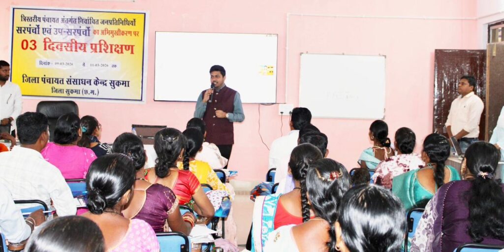 सुकमा – कलेक्टर अमित कुमार के मार्गदर्शन एवं जिला पंचायत के मुख्य कार्यपालन अधिकारी मुकुंद ठाकुर के नेतृत्व में राष्ट्रीय ग्राम स्वराज अभियान (आरजीएसए) के तहत पंचायत संसाधन केंद्र (डीपीआरसी) में 09 से 11 मार्च 2026 तक तीन दिवसीय आवासीय प्रशिक्षण कार्यक्रम आयोजित किया गया। इस प्रशिक्षण में विकासखंड छिन्दगढ़ और कोंटा के कुल 65 सरपंचों ने भाग लेकर पंचायत संचालन, विकास योजनाओं के प्रभावी क्रियान्वयन और सुशासन के विभिन्न पहलुओं की जानकारी प्राप्त की।