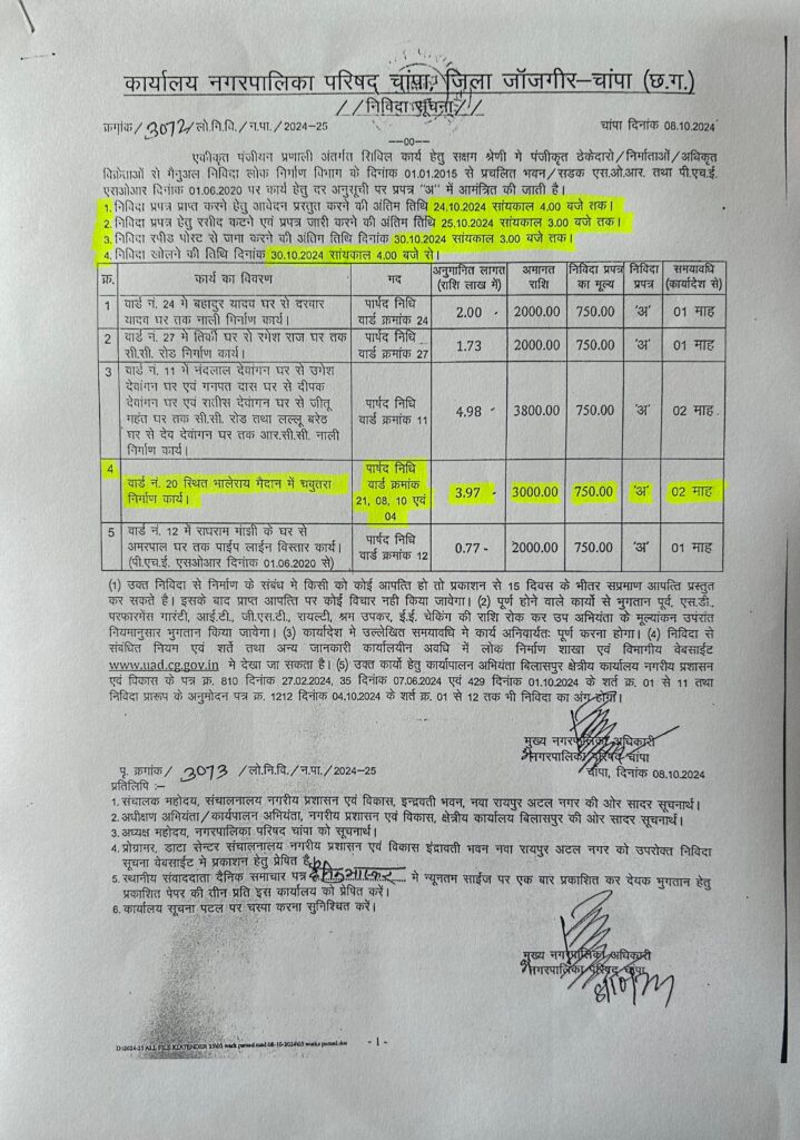 चांपा। नगर पालिका चांपा आजकल नई सुर्खियां बटोर रही है।ताजा मामला भालेराय मैदान में एक नया चबूतरा निर्माण का आया है जिसकी अनुमानित लागत 3 लाख 97 हजार बताया गया है जो कि पार्षद निधि द्वारा कराया जा रहा है। विगत 2 दिन पहले नगर पालिका परिषद चांपा द्वारा समाचार पत्र में प्रकाशित किया गया है। भालेराय मैदान में एक चबूतरे का निर्माण किया जाएगा जिसके लिए बाकायदा निविदा आमंत्रित की गई है। निविदा प्रस्तुत करने की समय 24 अक्टूबर 2024 निश्चित है तथा निवीदा खोलने तारीख 30 अक्टूबर 2024 तय की गई है। समझ से परे होने वाली बात तो यह है कि चबूतरा तो पहले ही बन चुका है।चबूतरे पर तो कार्यक्रम भी हो चुका है।कार्यक्रम की बात कर रहे हैं जो दशहरे पर जिस मंच पर देश की प्रसिद्ध गायिका जिया खान और बाली ठाकरे ने अपनी कला का प्रदर्शन किया था।