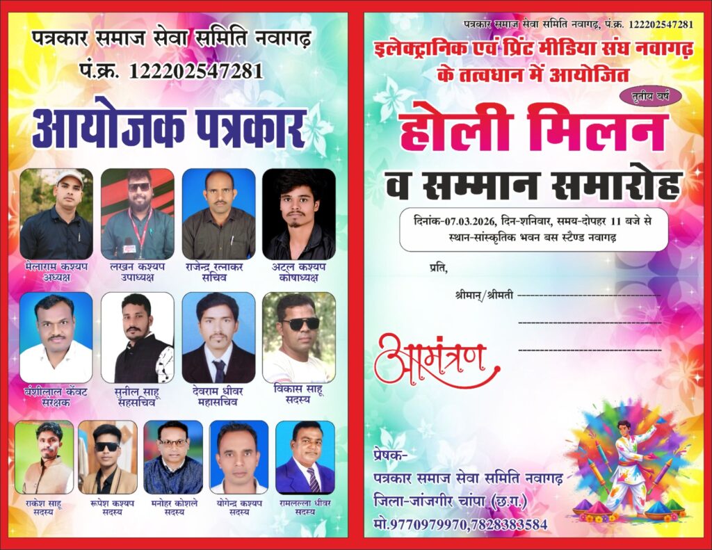 रिगनी / खरौद। पत्रकार समाज सेवा समिति एवं इलेक्ट्रॉनिक एवं प्रिंट मीडिया संघ नवागढ़ के संयुक्त तत्वावधान में तृतीय वर्ष होली मिलन एवं सम्मान समारोह का भव्य आयोजन आज 7 मार्च 2026, शनिवार को सांस्कृतिक भवन नवागढ़ में प्रातः 11 बजे से किया जाएगा। कार्यक्रम को लेकर समिति द्वारा व्यापक तैयारियां की जा रही हैं और क्षेत्र में उत्साह का माहौल है समारोह की मुख्य अतिथि जांजगीर-चांपा लोकसभा सांसद कमलेश जांगड़े होंगी, जबकि कार्यक्रम की अध्यक्षता पूर्व नेता प्रतिपक्ष एवं पूर्व विधायक नारायण चंदेल करेंगे विशिष्ट अतिथियों में जांजगीर विधायक व्यास कश्यप, भाजपा जिला अध्यक्ष अम्बेश जांगड़े, जिला पंचायत अध्यक्ष सत्यलता आनंद मिरी, जनपद पंचायत अध्यक्ष कांता मनमोहन कश्यप, शांति घासीराम कश्यप, अर्चना देवांगन तथा किसान मोर्चा के प्रदेश प्रवक्ता रवि पाण्डेय शामिल रहेंगे इसके अलावा आम आदमी पार्टी, कांग्रेस एवं भाजपा के पदाधिकारी, तहसील प्रशासन के अधिकारी, जनपद पंचायत के सीईओ तथा शिक्षा एवं स्वास्थ्य विभाग के अधिकारी भी आमंत्रित अतिथि के रूप में कार्यक्रम में उपस्थित रहेंगे।