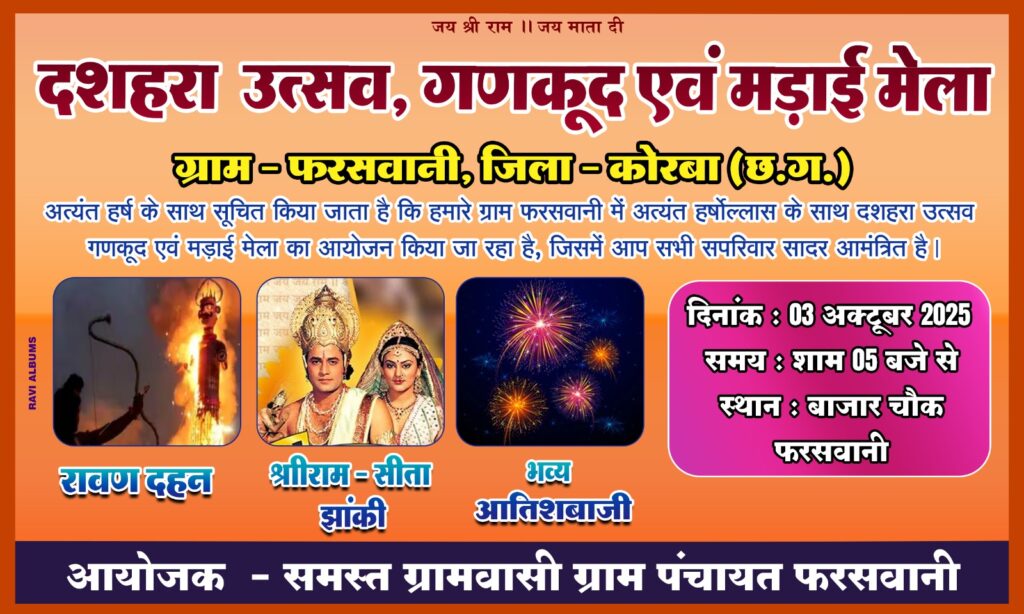 कोरबा। ग्राम पंचायत फरसवानी में 3 अक्टूबर दिन शुकवार को धूमधाम से दशहर उत्सव मनाया जाएगा। 02 अक्टूबर को गांधी जयंती के अवसर पर फ़रसवानी का प्रसिद्ध गणकूद प्रतियोगिता आयोजित नहीं कर पाने के कारण 3 अक्टूबर को दशहरा उत्सव मनाए जाने का निर्णय ग्राम पंचायत एवं सर्व नागरिकों द्वारा लिया गया है। इस दौरान भव्य मड़ाई मेला का भी आयोजन होगा। जिसमें बच्चों के लिए खेलने कूदने जंपिंग जैक, मिकी माउस सहित कई प्रकार के मनोरंजन की व्यवस्था होगी। आस पास के व्यापारी बंधुओं से भी इस आयोजन में शामिल होने की अपील की गई है.