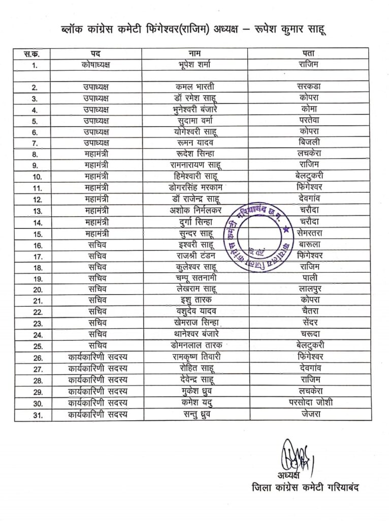 फिंगेश्वर ब्लॉक कांग्रेस कमेटी की नई कार्यकारिणी घोषित… जानिए किसे … किस पद की मिली जिम्मेदारी