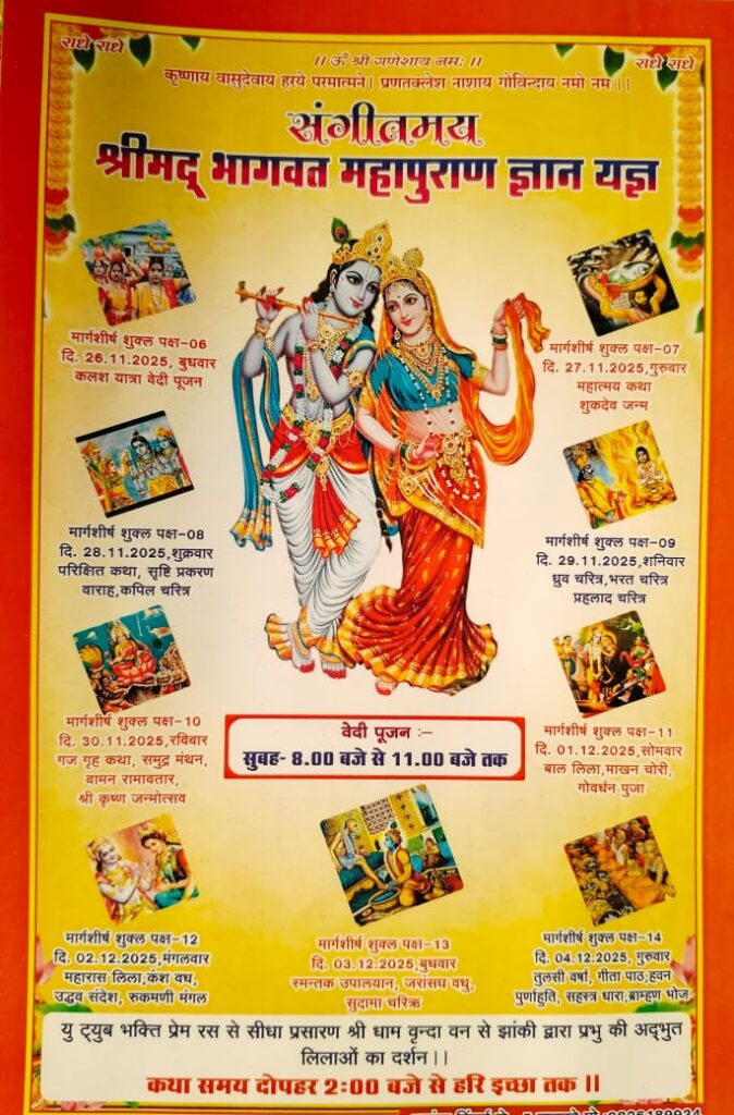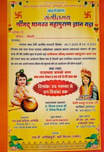 राजधानी से जनता तक| बालकोनगर। बालकोनगर में परसाभाठा वार्ड क्रमांक 45 के गली नंबर-3 (चंद्रा मोहल्ला) स्थित दुर्गा पंडाल में नव दुर्गा महिला समिति द्वारा दिनांक 26 नवंबर 2025 से दिनांक 04 दिसंबर 2025 तक संगीतमय श्रीमद् भागवत महापुराण ज्ञान यज्ञ आयोजित है। सरसिवां (सारंगढ़) की कथावाचिका भागवत मानस ब्यास देवी तन्नु पाठक जी द्वारा 9 दिनों तक प्रतिदिन दोपहर 2 बजे से हरि इच्छा तक अपने श्रीमुख से कथा का वाचन किया जाएगा।