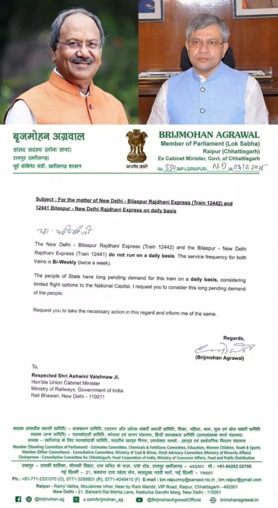 बैठक में राजधानी एक्सप्रेस की फ्रीक्वेंसी को सप्ताह में दो बार से बढ़ाकर दैनिक करने का आग्रह रखा गया। मांग में कहा गया कि ट्रेन के प्रतिदिन संचालित होने से छत्तीसगढ़ से राष्ट्रीय राजधानी नई दिल्ली, महाराष्ट्र और मध्य प्रदेश की कनेक्टिविटी मजबूत होगी। साथ ही यात्रियों को यात्रा समय की बचत और बेहतर सुविधा मिलेगी।
