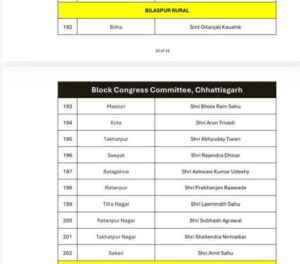 मस्तूरी । छत्तीसगढ़ प्रदेश कांग्रेस ने 307 ब्लॉक अध्यक्षों की सूची जंबो जारी कर दी है, जिसमें शहर और ग्रामीण क्षेत्र के ब्लॉक अध्यक्ष भी शामिल हैं। ऑल इंडिया कांग्रेस कमेटी ने इस सूची को मंजूरी दी है, जिसमें वरिष्ठ नेताओं और कार्यकर्ताओं के पसंद को भी ध्यान में रख कर सूची जारी किया गया है ।