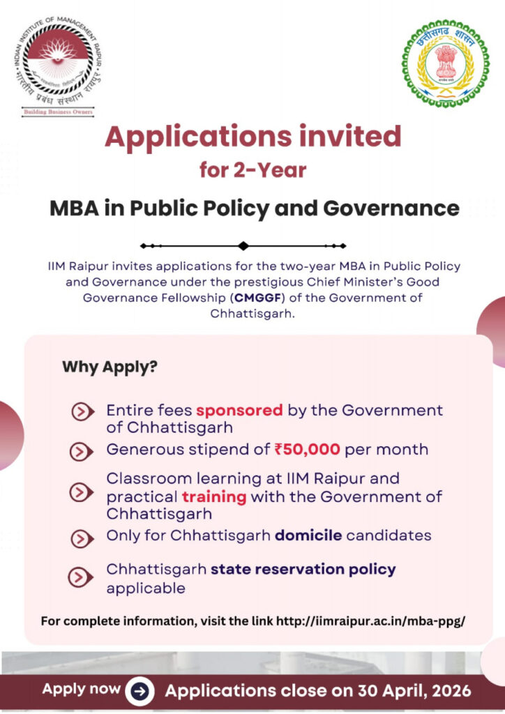 यह कार्यक्रम छत्तीसगढ़ शासन एवं IIM रायपुर के संयुक्त प्रयास से संचालित किया जा रहा है, जिसके अंतर्गत चयनित अभ्यर्थियों की पूरी फीस राज्य शासन द्वारा वहन की जाएगी। इसके साथ ही विद्यार्थियों को प्रति माह 50 हजार रूपए की छात्रवृत्ति भी प्रदान की जाएगी। कार्यक्रम की विशेषता यह है कि अभ्यर्थियों को IIM रायपुर में उच्च स्तरीय कक्षा शिक्षण के साथ-साथ राज्य शासन के विभिन्न विभागों के साथ व्यावहारिक प्रशिक्षण (फील्ड एक्सपोजर) का अवसर भी मिलेगा, जिससे उन्हें नीति निर्माण और प्रशासनिक कार्यों का वास्तविक अनुभव प्राप्त होगा। यह फेलोशिप विशेष रूप से छत्तीसगढ़ के मूल निवासियों के लिए उपलब्ध है तथा इसमें राज्य शासन की आरक्षण नीति लागू होगी। इच्छुक अभ्यर्थी विस्तृत जानकारी एवं आवेदन के लिए IIM रायपुर की आधिकारिक वेबसाइट पर निर्धारित तिथि तक आवेदन कर सकते हैं। उल्लेखनीय है कि IIM रायपुर की टीम द्वारा जशपुर जिले के सभी विकासखंडों के महाविद्यालयों का भ्रमण कर विद्यार्थियों को इस महत्वाकांक्षी कार्यक्रम से जोड़ने का प्रयास किया जा रहा है, जिससे प्रदेश के प्रतिभाशाली युवाओं को सुशासन के क्षेत्र में करियर बनाने का सुनहरा अवसर मिल सके।