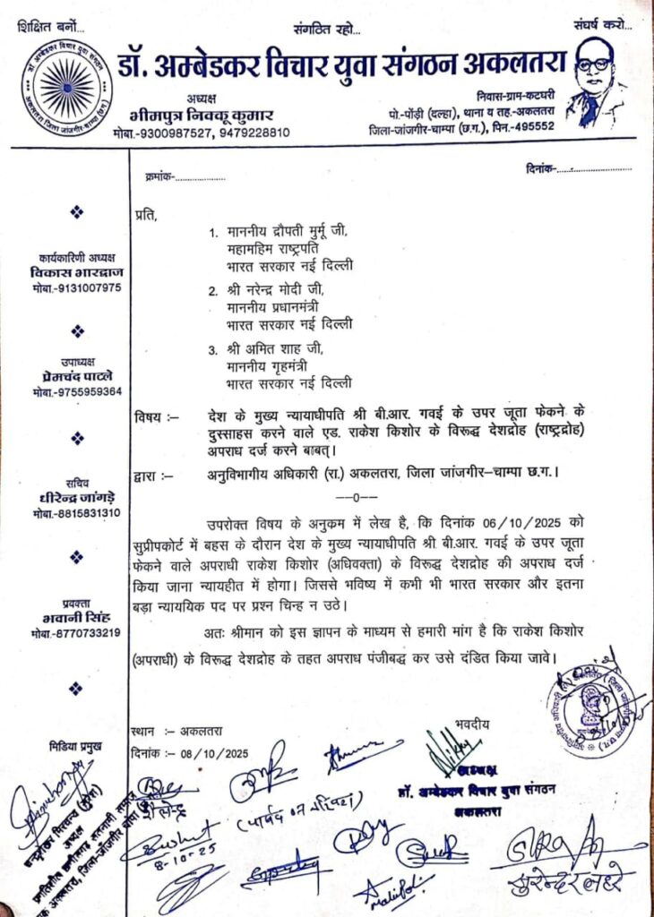 अकलतरा। देश के मुख्य न्यायाधीपति बी.आर. गवई के ऊपर जूता फेंकने की घटना को लेकर डॉ. अंबेडकर विचार युवा संगठन ने कड़ी नाराज़गी जताई है। संगठन ने मंगलवार को राष्ट्रपति, प्रधानमंत्री और गृह मंत्री के नाम अनुविभागीय अधिकारी (SDM) को ज्ञापन सौंपते हुए दोषी अधिवक्ता राकेश किशोर के खिलाफ देशद्रोह का प्रकरण दर्ज करने की मांग की।बसंगठन के पदाधिकारियों ने कहा कि 6 अक्टूबर को सुप्रीम कोर्ट में बहस के दौरान मुख्य न्यायाधीश पर जूता फेंकने की घटना न केवल निंदनीय है, बल्कि यह संविधान पर हमला करने जैसा कृत्य है। इस कृत्य से देशभर में संविधान को मानने वाले लोग आक्रोशित हैं। संगठन ने चेतावनी दी कि यदि आरोपी अधिवक्ता राकेश किशोर के खिलाफ शीघ्र ही देशद्रोह का मामला दर्ज नहीं किया गया, तो वे उग्र आंदोलन के लिए बाध्य होंगे।