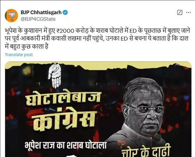 रायपुर । छत्तीसगढ़ के कथित 2000 करोड़ के शराब घोटाले की आग नए सरकार के कार्यकाल का 1 साल पूरा होने पर भी नहीं बुझी है. बीते दिनों पूर्व आबकारी मंत्री कवासी लखमा के घर में ईडी की दबीश से राज्य की राजनीति में उबाल आ गया है. अब पूछताछ के लिए कांग्रेस नेता कवासी लखमा के ईडी दफ्तर नहीं पहुंचने पर भाजपा ने सोशल मीडिया पर पोस्टर जारी करते हुए प्रहार किया है. सोशल मीडिया पर भाजपा ने एक पोस्ट जारी किया है. इसमें शराब घोटाले में पूर्व आबकारी मंत्री कवासी लखमा नहीं पहुंचे पर कहा है कि भूपेश के कुशासन में हुए 2000 करोड़ रुपए के शराब घोटाले में ईडी के पूछताछ में बुलाए जाने पर पूर्व आबकारी मंत्री कवासी लखमा नहीं पहुंचे, उनका ईडी से बचना ये बताता है कि दाल में बहुत कुछ काला है. मामले में ईडी की पूछताछ में कवासी लखमा सहयोग नहीं कर रहे हैं और मलाई चाटकर खुद को अनपढ़ बता रहे हैं।