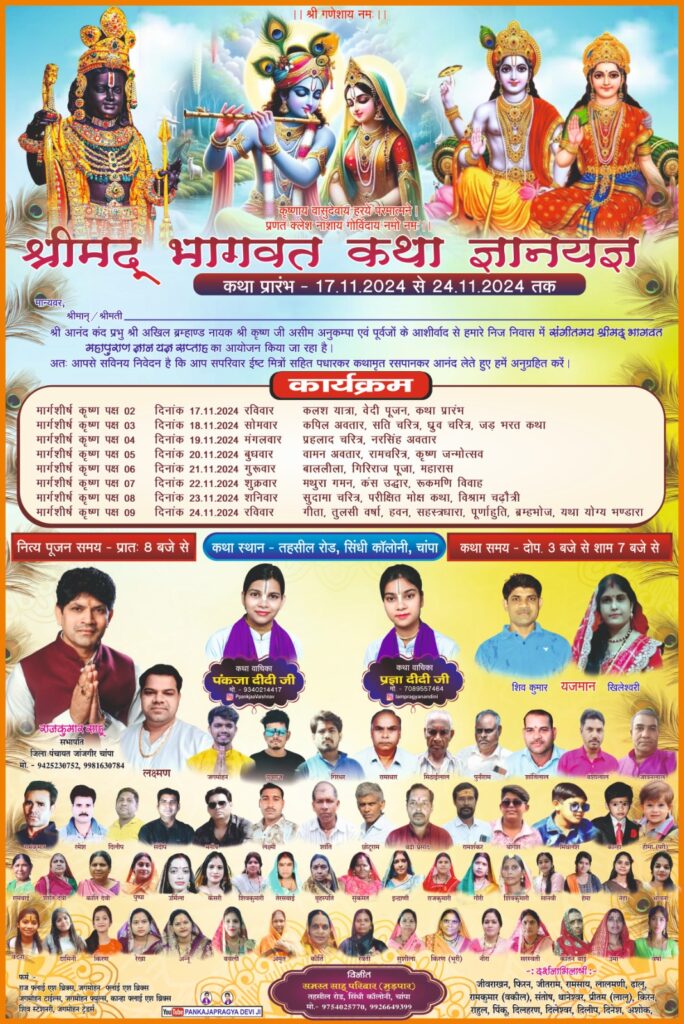 चांपा । भारतीय संस्कृति की आत्मा वेद-महापुराण हैं , उपनिषद उसका तत्व हैं । श्रीमद्भागवत गीता उसका हृदय हैं और रामायण तथा महाभारत उसकी दोनों आंखें हैं । भगवान श्रीकृष्ण और राम के जीवन गाथा पर अनेक काव्य और महाकाव्य लिखे गए हैं ,जो श्रद्धा और भक्ति भाव के साथ वंदनीय हैं । तहसील रोड स्थित साहू निवास परिसर में श्री आनंद कंद प्रभु श्री अखिल ब्रह्माण्ड नायक श्रीकृष्ण जी की असीम अनुकम्पा एवं पूर्वजों के आशीर्वाद से श्रीमद्भागवत कथा का आयोजन किया जा रहा हैं ।राजकुमार साहू सभापति ज़िला जांजगीर-चांपा के निवास स्थल पर श्रीमद्भागवत कथा महात्म्य का आयोजन दिनांक 17 नवंबर से 24 नवंबर, 2024 तक किया जा रहा हैं । श्रीमद्भागवत कथा का चतुर्थ दिनांक 17 नवंबर , 2024 से दिनांक 24 नवंबर 2024 तक आयोजित हैं ।