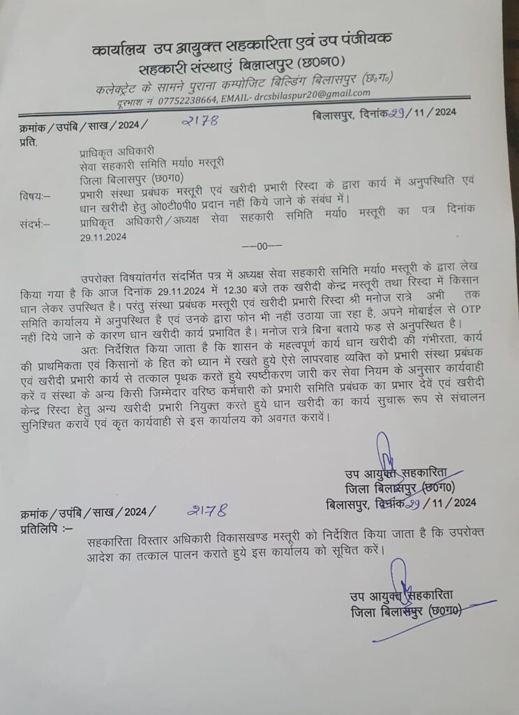 सेवा सहकारी मस्तूरी के प्रबन्धक मनोज रात्रे को अपने कार्य मे लापरवाही करना भारी पड़ गया। उपायुक्त सहकारिता श्रीमती मंजू पांडेय द्वारा उन्हें समिति प्रबंधक एवं धान खरीदी प्रभारी के पद से पृथक करने हेतु आदेशित किया गया है। सेवा सहकारी समिति मस्तूरी के समिति प्रबन्धक मनोज रात्रे दिनाँक 29/11/2024 को दोपहर 12:30 बजे तक न तो धान खरीदी केंद्र में उपस्थित हुए न ही फोन उठाया। जिससे धान खरीदी के लॉगिन हेतु उनके मोबाईल में प्राप्त होने वाले ओटीपी प्राप्त नही किया जा सका व खरीदी कार्य बाधित हुई। जिसकी लगभग 28 किसानों द्वारा हस्ताक्षरयुक्त शिकायत की गई । इस सम्बंध में समिति के अध्यक्ष द्वारा उप पंजीयक को लिखित में अवगत कराया गया। धान खरीदी जैसे महत्वपूर्ण कार्य को गम्भीरता से न लेने तथा लापरवाही के कारण धान खरीदी कार्य बाधित होने के फलस्वरूप उपायुक्त एवम उपपंजीयक द्वारा समिति प्रबन्धक को तत्काल पद से पृथक करने हेतु समिति के प्राधिकृत अधिकारी को आदेशित किया गया एवं स्पष्टीकरण जारी कर सेवा नियम के अनुसार कार्यवाही करने निर्देश दिया । जिसके पालन में समिति प्राधिकृत द्वारा तत्काल प्रभाव से अन्य कर्मचारी को समिति प्रबन्धक का प्रभार दिया गया तथा रिसदा खरीदी केंद्र का प्रभार बदला गया ।