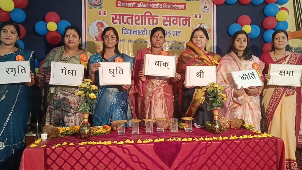 देवभोग -लंकेश्वरी बाल संस्कार समिति देवभोग द्वारा संचालित सरस्वती शिशु मंदिर उच्चतर माध्यमिक विद्यालय देवभोग में आज विद्या भारती अखिल भारतीय शिक्षा संस्थान के तत्वाधान में समृद्ध भारत एवं समाज परिवर्तन हेतु मातृ शक्ति के सामर्थ्य ,नेतृत्व एवं राष्ट्र निर्माण हेतु ‘ सप्तशक्ति संगम ‘कार्यक्रम आयोजित किया गया । इस कार्यक्रम का मुख्य उद्देश्य यह है कि माताओं के अंदर निहित सप्तशक्ति अर्थात 7 शक्तियां कीर्ति ,श्री , वाक , स्मृति , मेधा, धृति, क्षमा को जागृत करना है । सप्तशक्ति संगम के ऐसे कार्यक्रम मातृशक्ति जागरण हेतु विद्या भारती के माध्यम से संपूर्ण भारत में आयोजित किया जा रहे हैं । इस कार्यक्रम की मुख्य अतिथि नेहा सिंघल जिला पंचायत सदस्य जिला गरियाबंद, तथा उनके साथ में अध्यक्षता- पदमालया निधि (जनपद पंचायत अध्यक्ष देवभोग )विशिष्ट अतिथि शशि अवस्थी (गृहलक्ष्मी )) बबीता अग्रवाल (गृह लक्ष्मी )एवं मुख्य वक्ता प्रतिभा पांडे समाजसेविका एवं भाग्यश्री सोनी शिक्षिका रही ।