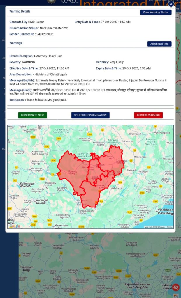 सुकमा- मौसम विभाग द्वारा जारी पूर्वानुमान के अनुसार अगले 24 घंटों में (28 अक्टूबर सुबह 08:30 बजे से 29 अक्टूबर सुबह 08:30 बजे तक) बस्तर संभाग के बस्तर, बीजापुर, दंतेवाड़ा और सुकमा जिलों में अधिकांश स्थानों पर अत्यधिक भारी वर्षा की संभावना व्यक्त की गई है।