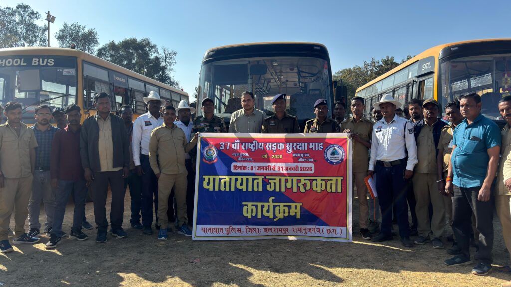 बलरामपुर :- बलरापमुर रामानुगंज जिले के अंतर्गत पुलिस अधीक्षक वैभव बैंकर के मार्गदर्षन में तथा अतिरिक्त पुलिस अधीक्षक विष्व दीपक त्रिपाठी के निर्देषन में 37 वां राष्ट्रीय सड़क सुरक्षा माह का आयोजन दिनांक 01जनवरी से 31जनवरी.2026 तक किया जा रहा है। जिसके तहत जिला बलरामपुर रामानुजगंज के समस्त अनुभाग मुख्यालयों में यातायात जागरूकता संबंधित विभिन्न कार्यक्रमों का आयोजन किया जा रहे हैं। इसी कड़ी में दिनांक 18 जनवरी रविवार को जिले के अनुभाग मुख्यालयों (शंकरगढ़, वाड्रफनगर, एवं रामानुजगंज) में पुलिस एवं परिवहन विभाग द्वारा सामन्जस्य स्थापित कर ‘‘स्कूली बस निरीक्षण शिविर’’ कार्यक्रम का आयोजन किया गया। जिसमें जिले से सभी शासकीय एवं अशासकीय स्कुलों में अध्ययनरत् छात्र छात्राओं का परिवहन करने वाले शैक्षणिक संस्थानों के बसों की जांच हेतु बुलाया गया था जिसमें कुल 52 बसें जांच हेतु उपस्थित हुये।