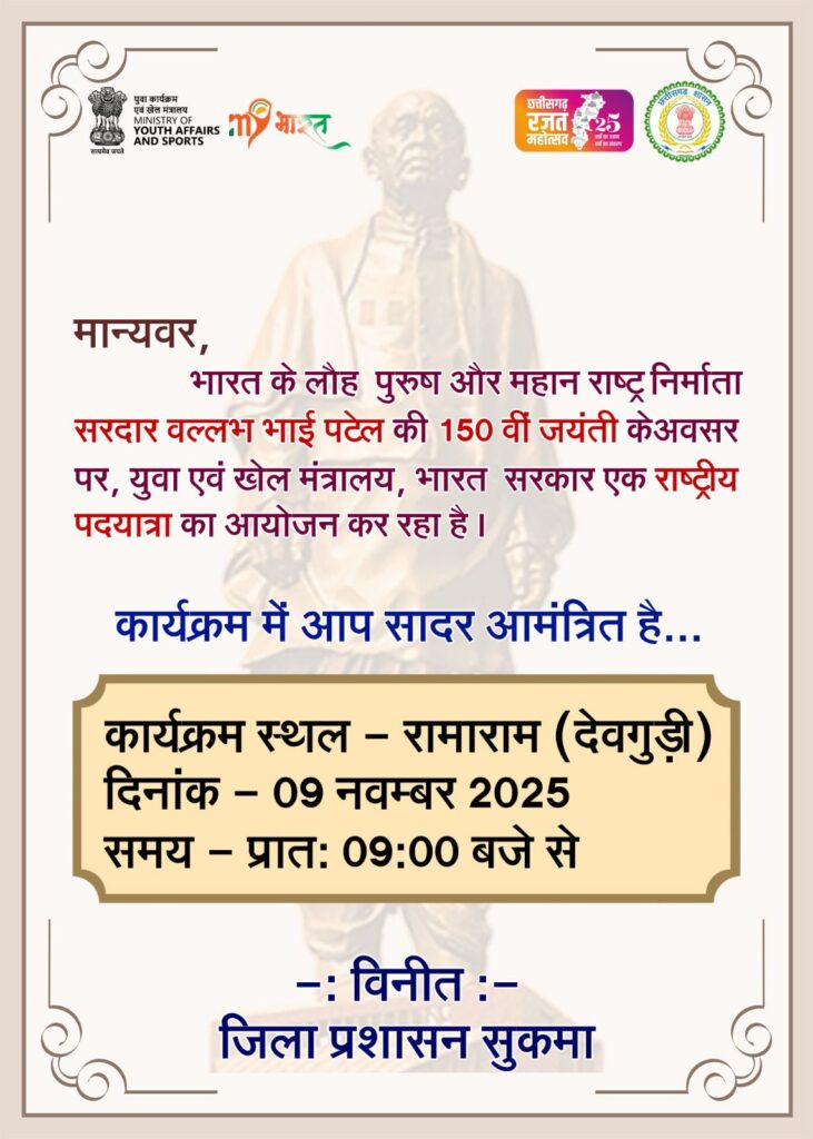 सुकमा/ भारत के लौह पुरुष एवं महान राष्ट्र निर्माता सरदार वल्लभभाई पटेल की 150वीं जयंती के अवसर पर पूरे देश में राष्ट्रीय पदयात्रा (यूनिटी मार्च) का आयोजन किया जा रहा है। इसी कड़ी में युवा एवं खेल मंत्रालय, भारत सरकार के मार्गदर्शन में सुकमा जिला प्रशासन द्वारा एक विशेष ‘यूनिटी मार्च’ का आयोजन किया जा रहा है।