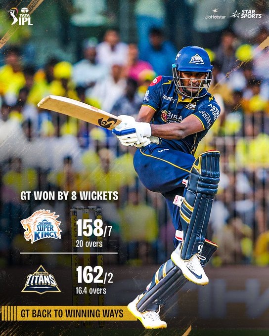 नईदिल्ली । इंडियन प्रीमियर लीग 2026 के 37वें मैच में गुजरात टाइटंस ने चेन्नई सुपर किंग्स को 8 विकेट मात दे दी. एम चिदंबरम स्टेडियम में खेले गए मैच में गुजरात ने 159 रनों के लक्ष्य को साई सुदर्शन की 87 रनों की पारी की बदौलत 16.4 ओवर में दो विकेट के नुकसान पर ही आसानी से हासिल कर लिया. इस जीत के साथ गुजरात अंक तालिका में 8 पॉइंट्स के साथ पांचवें नंबर पर पहुंच गया है और चेन्नई सुपर किंग्स एक स्थान नीचे खिसक कर छठे स्थान पर चला गया.